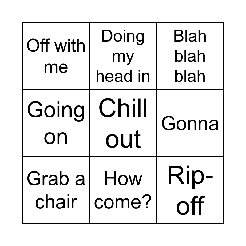 This bingo card has 14 words: What’s up, Stressed out, Grab a chair, Doing my head in, Going on, Chill out, Rip-off, Wanna, How come?, Off with me, Like, Gonna, Blah blah blah and All right?.