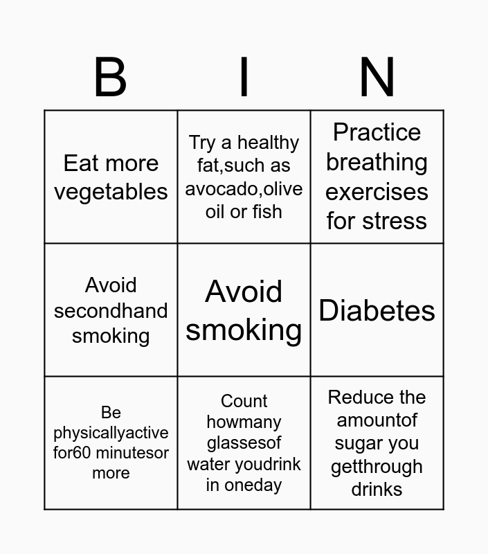 This bingo card has 12 words: Keep Active and exercise often, Reduce the amountof sugar you getthrough drinks, Avoid smoking, Diabetes, Try a healthy fat,such as avocado,olive oil or fish, Practice breathing exercises for stress, Count howmany glassesof water youdrink in oneday, Cholesterol, Eat more vegetables, Avoid secondhand smoking, Be physicallyactive for60 minutesor more and Get enough sleep.