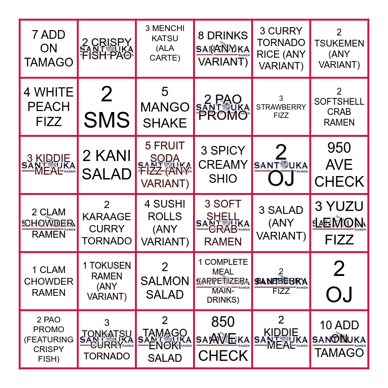 This bingo card has 16 images and 36 words: 1 COMPLETE MEAL (APPETIZER-MAIN-DRINKS), 2 SALMON SALAD, 850 AVE CHECK, 4 WHITE PEACH FIZZ, 2 CLAM CHOWDER RAMEN, 3 SPICY CREAMY SHIO, 2 SMS, 2 TAMAGO ENOKI SALAD, 3 CURRY TORNADO RICE (ANY VARIANT), 2 BLUEBERRY FIZZ, 2 SOFTSHELL CRAB RAMEN, 8 DRINKS (ANY VARIANT), 2 OJ, 2 KANI SALAD, 2 PAO PROMO, 7 ADD ON TAMAGO, 1 CLAM CHOWDER RAMEN, 2 OJ, 3 KIDDIE MEAL, 3 MENCHI KATSU (ALA CARTE), 5 FRUIT SODA FIZZ (ANY VARIANT), 2 KARAAGE CURRY TORNADO, 3 SOFT SHELL CRAB RAMEN, 4 SUSHI ROLLS (ANY VARIANT), 3 SALAD (ANY VARIANT), 2 CRISPY FISH PAO, 3 STRAWBERRY FIZZ, 3 TONKATSU CURRY TORNADO, 5 MANGO SHAKE, 2 TSUKEMEN (ANY VARIANT), 10 ADD ON TAMAGO, 2 PAO PROMO (FEATURING CRISPY FISH), 3 YUZU LEMON FIZZ, 950 AVE CHECK, 1 TOKUSEN RAMEN (ANY VARIANT) and 2 KIDDIE MEAL.