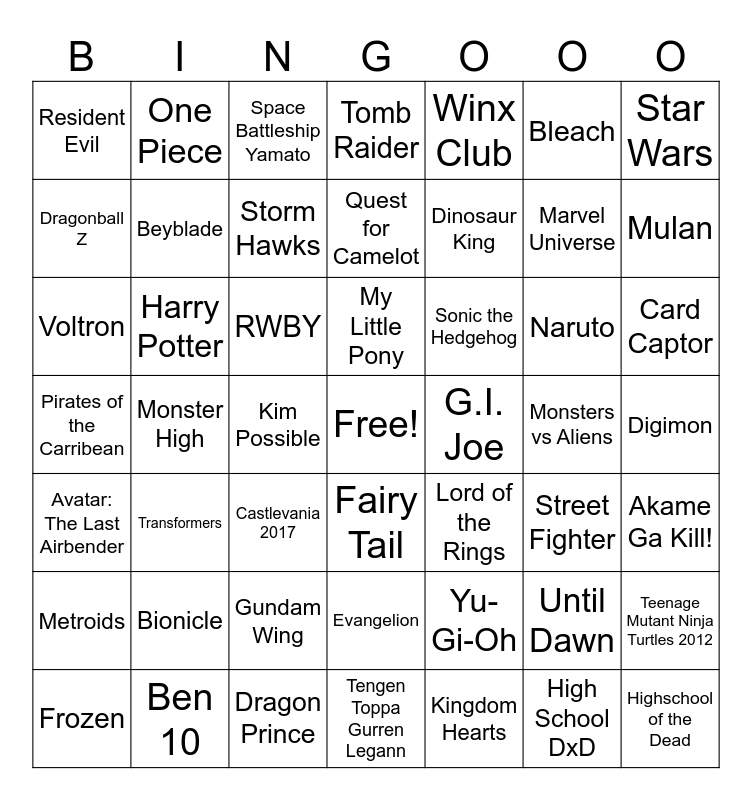 This bingo card has a free space and 64 words: Pokemon, Digimon, DC Universe, Naruto, Castlevania 2017, Frozen, One Piece, Totally Spies, Dragonball Z, Ben 10, My Little Pony, Yu-Gi-Oh, Voltron, Winx Club, Kill la Kill, Bleach, Dinosaur King, Resident Evil, Sailor Moon, Beyblade, RWBY, Harry Potter, Tomb Raider, Transformers, Martin Mystery, Street Fighter, Fairy Tail, Fallen Throne, Monsters vs Aliens, Metroids, Attack on Titan, Evangelion, Mortal Combat, Dead or Alive, Storm Hawks, Card Captor, Until Dawn, Kim Possible, Akame Ga Kill!, Star Wars, Quest for Camelot, Mulan, Teenage Mutant Ninja Turtles 2012, She-Ra and the Princesses of Power, Dragon Prince, Marvel Universe, Pirates of the Carribean, Highschool of the Dead, Sonic the Hedgehog, Tengen Toppa Gurren Legann, High School DxD, Full Metal Alchemist, Monster High, Avatar: The Last Airbender, Soul Eater, Gundam Wing, Space Battleship Yamato, Star Trek, Lord of the Rings, Bionicle, Kingdom Hearts, Little Witch Academia, G.I. Joe and Princess Comet.