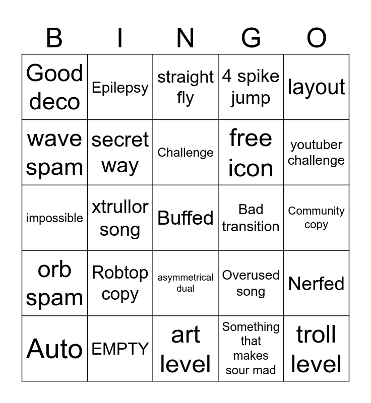 This bingo card has a free space and 24 words: Robtop copy, EMPTY, Challenge, Auto, layout, Good deco, wave spam, Epilepsy, Bad transition, asymmetrical dual, free icon, impossible, Overused song, Nerfed, secret way, Something that makes sour mad, Community copy, straight fly, youtuber challenge, xtrullor song, troll level, orb spam, 4 spike jump and art level.