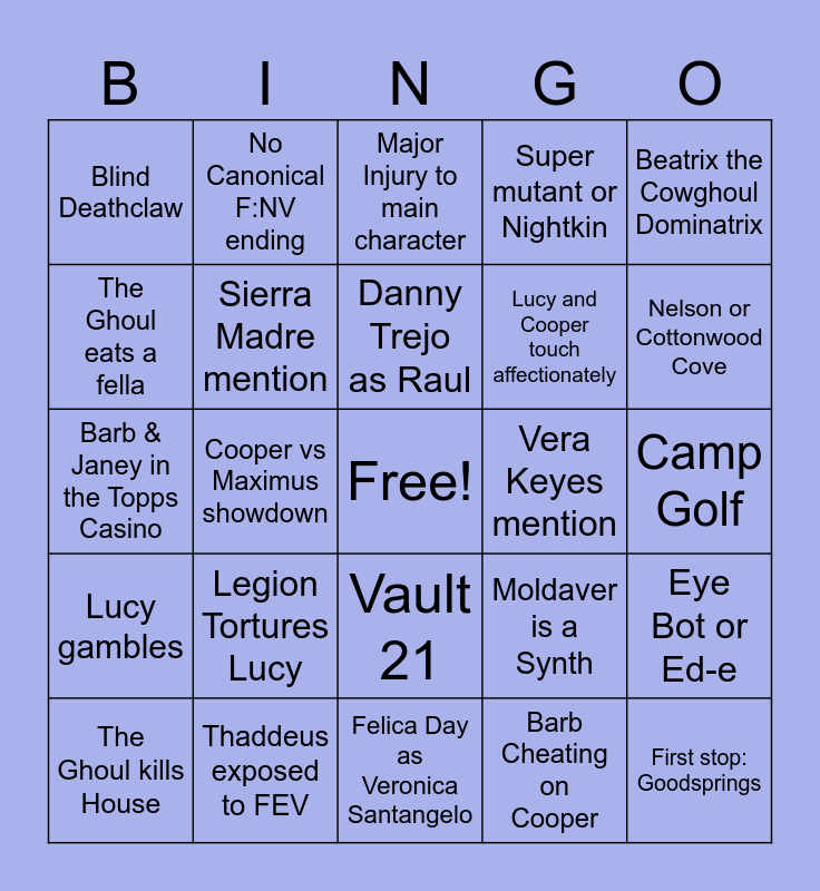 This bingo card has a free space and 24 words: Legion Tortures Lucy, Thaddeus exposed to FEV, Danny Trejo as Raul, The Ghoul kills House, Beatrix the Cowghoul Dominatrix, Blind Deathclaw, The Ghoul eats a fella, No Canonical F:NV ending, Vera Keyes mention, Vault 21, Lucy and Cooper touch affectionately, Barb & Janey in the Topps Casino, Moldaver is a Synth, Eye Bot or Ed-e, Sierra Madre mention, Barb Cheating on Cooper, Camp Golf, Major Injury to main character, Nelson or Cottonwood Cove, Cooper vs Maximus showdown, First stop: Goodsprings, Lucy gambles, Super mutant or Nightkin and Felica Day as Veronica Santangelo.