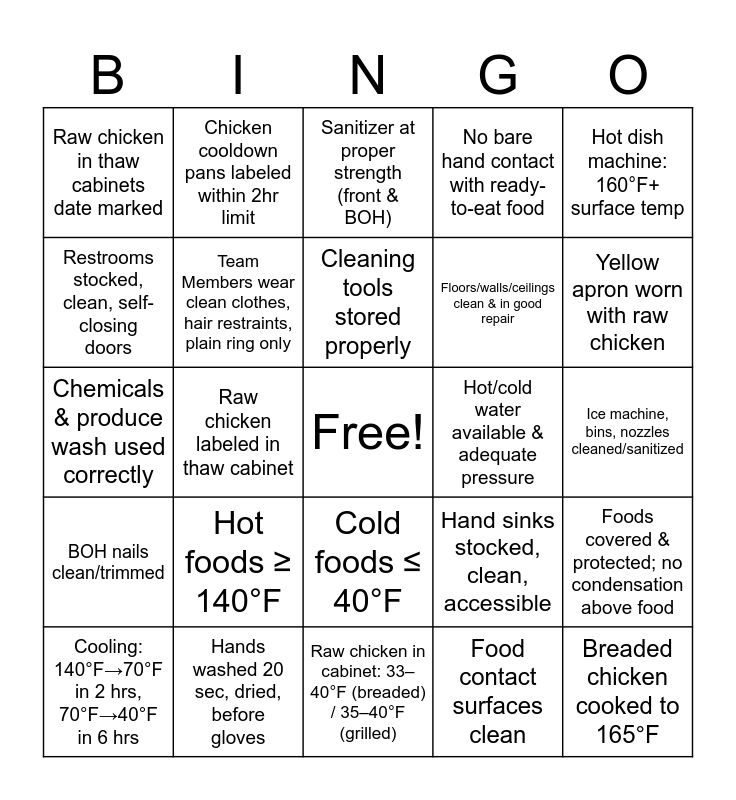 This bingo card has a free space and 44 words: Grilled chicken cooked to 165°F, Breaded chicken cooked to 165°F, TCS/PHF foods cooked/reheated to proper temps, Cooling: 140°F→70°F in 2 hrs, 70°F→40°F in 6 hrs, Fruits/veggies washed; produce wash used properly, Food contact surfaces clean, Sanitizer at proper strength (front & BOH), Produce wash at proper strength, Hot dish machine: 160°F+ surface temp, Hands washed 20 sec, dried, before gloves, No bare hand contact with ready-to-eat food, Hot/cold water available & adequate pressure, Cold foods ≤ 40°F, Hot foods ≥ 140°F, Grill deflector plates installed, Raw chicken in cabinet: 33–40°F (breaded) / 35–40°F (grilled), Food stored in proper hierarchy, Chemicals & produce wash used correctly, Raw chicken only in thaw cabinet or walk-in bottom shelf, Yellow apron worn with raw chicken, Chicken cooldown pans labeled within 2hr limit, Food thermometer available & accurate, Cold holding units have visible thermometers, Raw chicken in thaw cabinets date marked, Produce in good condition, Ice machine, bins, nozzles cleaned/sanitized, Chemicals approved & labeled, Food contact surfaces are free of chemicals (includes redwipes), Hand sinks stocked, clean, accessible, BOH nails clean/trimmed, FOH nails neat/no acrylics, Foods covered & protected; no condensation above food, Containers labeled with common name, Food & packaging stored 6” off floor, Raw chicken labeled in thaw cabinet, Clean utensils stored properly; handles up/out, In-use utensils stored clean/safe, Non-food contact surfaces cleaned (handles, gaskets, shelves, etc.), Cleaning tools stored properly, Restrooms stocked, clean, self-closing doors, Floors/walls/ceilings clean & in good repair, Interior garbage cleaned/emptied as needed, Team Members wear clean clothes, hair restraints, plain ring only and Exterior garbage covered, clean, in good repair.