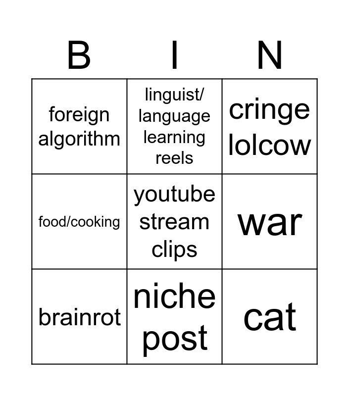 This bingo card has a free space and 8 words: war, cringe lolcow, linguist/ language learning reels, brainrot, foreign algorithm, cat, food/cooking and niche post.