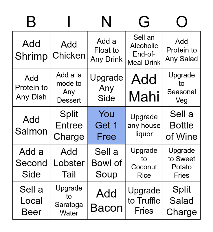 This bingo card has a free space and 24 words: Add Lobster Tail, Upgrade to Saratoga Water, Upgrade Any Side, Sell a Local Beer, Add Protein to Any Salad, Add Shrimp, Add Protein to Any Dish, Add Chicken, Upgrade any house liquor, Sell a Bowl of Soup, Add Mahi, Add Salmon, Upgrade to Coconut Rice, Upgrade to Sweet Potato Fries, Add a la mode to Any Dessert, Upgrade to Truffle Fries, Sell a Bottle of Wine, Add a Float to Any Drink, Upgrade to Seasonal Veg, Split Entree Charge, Split Salad Charge, Add a Second Side, Sell an Alcoholic End-of-Meal Drink and Add Bacon.