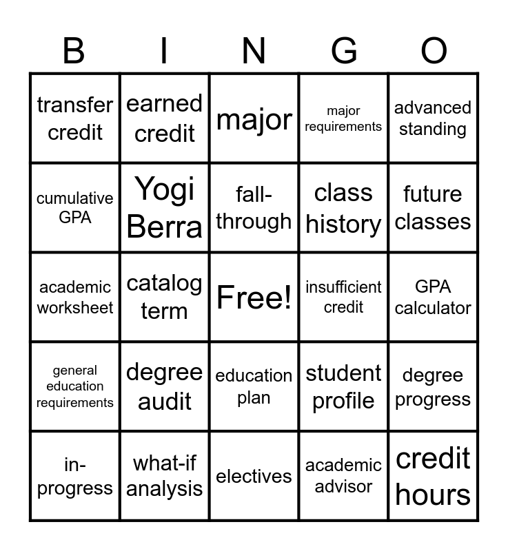 This bingo card has a free space and 24 words: degree audit, what-if analysis, fall-through, in-progress, advanced standing, transfer credit, cumulative GPA, earned credit, insufficient credit, education plan, class history, academic worksheet, student profile, degree progress, Yogi Berra, academic advisor, GPA calculator, major, future classes, catalog term, credit hours, general education requirements, major requirements and electives.