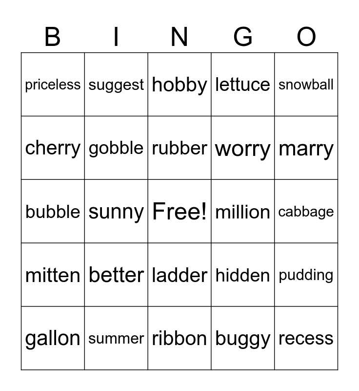 This bingo card has a free space and 26 words: ladder, buggy, rubber, summer, snowball, priceless, cherry, suggest, cabbage, hidden, worry, bubble, pudding, gallon, sunny, happen, lettuce, mitten, hobby, recess, marry, ribbon, million, better, gobble and cottage.