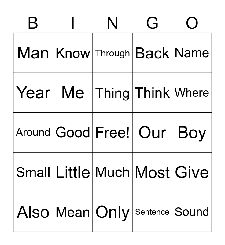 This bingo card has a free space and 50 words: New, Sound, Take, Only, Little, Work, Know, Place, Year, Live, Me, Back, Give, Most, Very, After, Thing, Our, Just, Name, Good, Sentence, Man, Think, Say, Great, Where, Help, Through, Much, Before, Line, Right, Too, Mean, Old, Any, Same, Tell, Boy, Follow, Came, Went, Show, Also, Around, Form, Three, Small and Set.