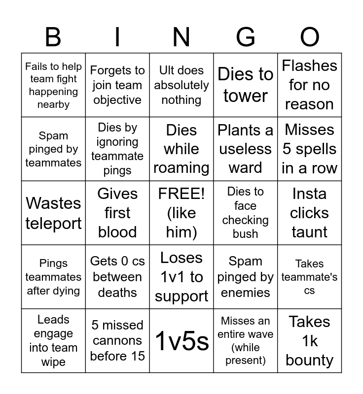 This bingo card has a free space and 24 words: Gets 0 cs between deaths, 5 missed cannons before 15, Dies while roaming, Leads engage into team wipe, Flashes for no reason, Fails to help team fight happening nearby, Spam pinged by teammates, Forgets to join team objective, Dies to face checking bush, Loses 1v1 to support, Plants a useless ward, Wastes teleport, Spam pinged by enemies, Takes teammate's cs, Dies by ignoring teammate pings, Misses an entire wave (while present), Insta clicks taunt, Ult does absolutely nothing, Misses 5 spells in a row, Gives first blood, Takes 1k bounty, Pings teammates after dying, Dies to tower and 1v5s.