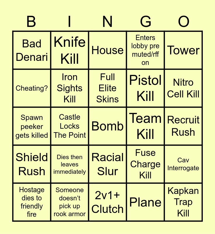 This bingo card has 43 words: Secure Area, Bomb, Hostage, Hostage dies to friendly fire, Someone aces a round, Plane, House, Yacht, Tower, Someone doesn’t pick up rook armor, Enters lobby pre muted/rff on, Team Kill, Racial Slur, Dies then leaves immediately, 3-0, 2v1+ Clutch, Spawn peeker gets a kill, Spawn peeker gets killed, Ash rush, Nitro Cell Kill, Knife Kill, Claymore Kill, Dogshit Reinforcement, Bad Denari, Bad Cav, Recruit Rush, Ying Team Flash, Bandit Trick, Fuse Charge Kill, Shield Rush, Sledgehammer Kill, Cav Interrogate, Meme Valk Cam, Castle Locks The Point, Useless Doc, Rook No Armor, Kapkan Trap Kill, Full Elite Skins, Cheating?, Pistol Kill, Shotgun Kill, Iron Sights Kill and 3-2 Victory.