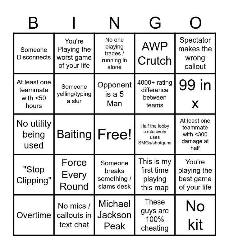 This bingo card has a free space and 24 words: Force Every Round, No mics / callouts in text chat, Opponent is a 5 Man, Overtime, Spectator makes the wrong callout, Someone Disconnects, At least one teammate with <50 hours, You're Playing the worst game of your life, Half the lobby exclusively uses SMGs/shotguns, Someone breaks something / slams desk, 4000+ rating difference between teams, No utility being used, This is my first time playing this map, You're playing the best game of your life, Someone yelling/typing a slur, These guys are 100% cheating, At least one teammate with <300 damage at half, No one playing trades / running in alone, 99 in x, Baiting, No kit, "Stop Clipping", AWP Crutch and Michael Jackson Peak.