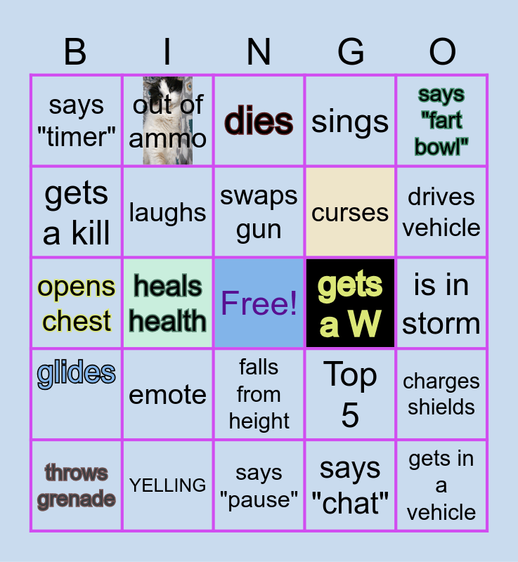 This bingo card has 1 images, a free space and 24 words: emote, YELLING, swaps gun, throws grenade, says "fart bowl", says "timer", gets a kill, out of ammo, gets a W, falls from height, curses, opens chest, Top 5, charges shields, laughs, says "chat", is in storm, dies, drives vehicle, heals health, gets in a vehicle, glides, sings and says "pause".
