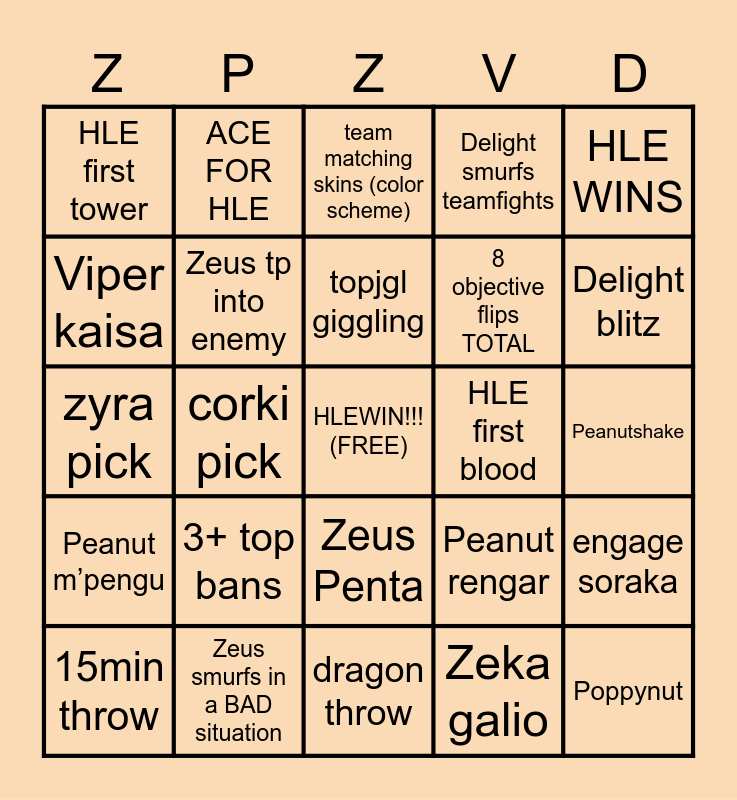 This bingo card has a free space and 93 words: stole an obj, missed smite, dragon throw, atakhan throw, hle contest herald, sick herald driving, herald knocks someone up, 15min throw, baron throw, winions, Matching emotes, Wombo combo, HLE dies to turret, 8 objective flips TOTAL, no drakes🔥 #kendrickwin, HLE WINS, team matching skins (color scheme), team matching champs (color scheme), maid nidalee/ poppy, 3 losing lanes on red side, no tank team comp, team comp with 1 engage, 4 man wipe during bot dive, Zeus ambessa, 3+ top bans, Zeus tp into enemy, Zeus on tank, jayce emote, Ranged top, Zeus sion carry, Zeus smurfs in a BAD situation, Zeus Penta, Zeus yapping during draft, 4 man dive on Zeus, ACE FOR HLE, Zeus Fiora, Zeus Yorick, nidalee flex, topjgl giggling, Peanut rengar, zyra pick, Peanut m’pengu, Peanutshake, Peanut shyvana, Poppynut, Pantheon dive fail, Peanut J4, Zeka eyedrops, akali hover, Zeka 1v5s on melee champ, Zeze melee solo lanes, Zeka galio, Zeka leblanc, Zeka Kassadin, Zeka zed, zezeper vladimir flex, Zeka bee sad emote, Zeka drx akali skin, Zeka going from 0/3 to 10/3, Zeka using HOL ahri, corki pick, Viper flashes forward, Viper flank, aphel hover, Viper last man standing, Viper jinx carry, zeus/doran comparison, Viper penta, Viper kaisa, Bot playing smart while topside runs it down, xakan botduo, Delight 4+ man engage, Delight renata glasc 👅, Delight smurfs teamfights, Delight bard, Delight pyke, Delight blitz, engage soraka, Delight smite steals, Delight game saving engage, Delight roams @ 3mins, senna ornn botduo, HLE first blood, HLE first tower, HLE feats of strength, Delight steals a kill, Zeus top dmg, Viper top dmg, Zeka top dmg, Peanut top dmg, Delight not least dmg, denied/stolen penta and viper yunara.