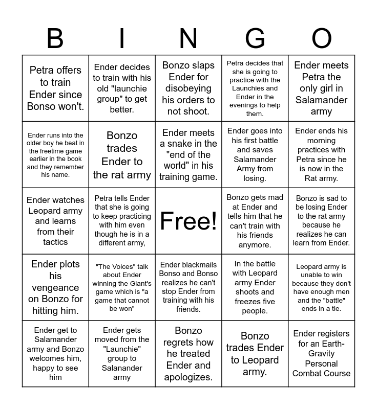 This bingo card has a free space and 24 words: "The Voices" talk about Ender winning the Giant's game which is "a game that cannot be won", Ender gets moved from the "Launchie" group to Salanander army, Ender meets a snake in the "end of the world" in his training game., Ender get to Salamander army and Bonzo welcomes him, happy to see him, Ender meets Petra the only girl in Salamander army, Petra offers to train Ender since Bonso won't., Ender runs into the older boy he beat in the freetime game earlier in the book and they remember his name., Ender decides to train with his old "launchie group" to get better., Bonzo gets mad at Ender and tells him that he can't train with his friends anymore., Ender blackmails Bonso and Bonso realizes he can't stop Ender from training with his friends., Ender goes into his first battle and saves Salamander Army from losing., Ender watches Leopard army and learns from their tactics, In the battle with Leopard army Ender shoots and freezes five people., Leopard army is unable to win because they don't have enough men and the "battle" ends in a tie., Bonzo trades Ender to the rat army, Bonzo trades Ender to Leopard army., Bonzo is sad to be losing Ender to the rat army because he realizes he can learn from Ender., Bonzo slaps Ender for disobeying his orders to not shoot., Ender ends his morning practices with Petra since he is now in the Rat army., Petra tells Ender that she is going to keep practicing with him even though he is in a different army,, Ender registers for an Earth-Gravity Personal Combat Course, Ender plots his vengeance on Bonzo for hitting him., Petra decides that she is going to practice with the Launchies and Ender in the evenings to help them. and Bonzo regrets how he treated Ender and apologizes..
