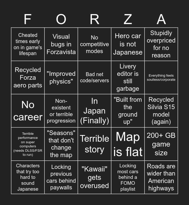 This bingo card has a free space and 24 words: "Seasons" that don't change the map, Locking previous cars behind paywalls, Bad net code/servers, Characters that try too hard to sound Japanese, Stupidly overpriced for no reason, Cheated times early on in game's lifespan, Recycled Forza aero parts, Visual bugs in Forzavista, "Built from the ground up", Terrible story, Livery editor is still garbage, No career, Map is flat, 200+ GB game size, "Improved physics", Locking most cars behind a FOMO playlist, Recycled Silvia S15 model (again), No competitive modes, Everything feels soulless/corporate, Non-existent or terrible progression, Roads are wider than American highways, Terrible performance on super computers (needs DLSS/FSR to run), Hero car is not Japanese and "Kawaii" gets overused.