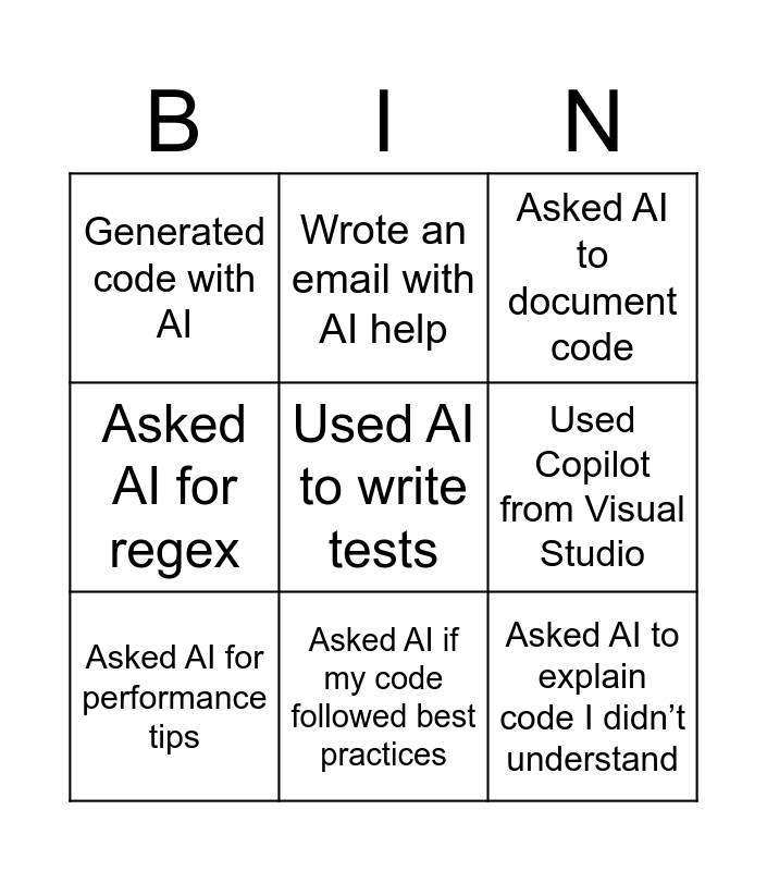 This bingo card has 12 words: Used AI to create slides for a presentation, Asked AI to explain code I didn’t understand, Used AI to write tests, Used Copilot from Visual Studio, Wrote an email with AI help, Asked AI to document code, Asked AI if my code followed best practices, Used Copilot from Teams, Generated code with AI, Asked AI for regex, Asked AI for performance tips and Asked AI for a variable / function name.