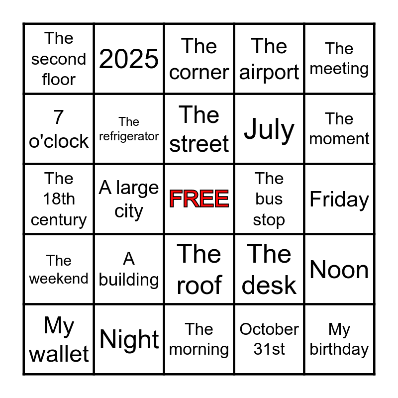 This bingo card has a free space and 24 words: A building, Night, The street, My wallet, The meeting, The second floor, 7 o'clock, 2025, The bus stop, The roof, July, The 18th century, The desk, Noon, The refrigerator, October 31st, Friday, The corner, The moment, A large city, My birthday, The weekend, The airport and The morning.
