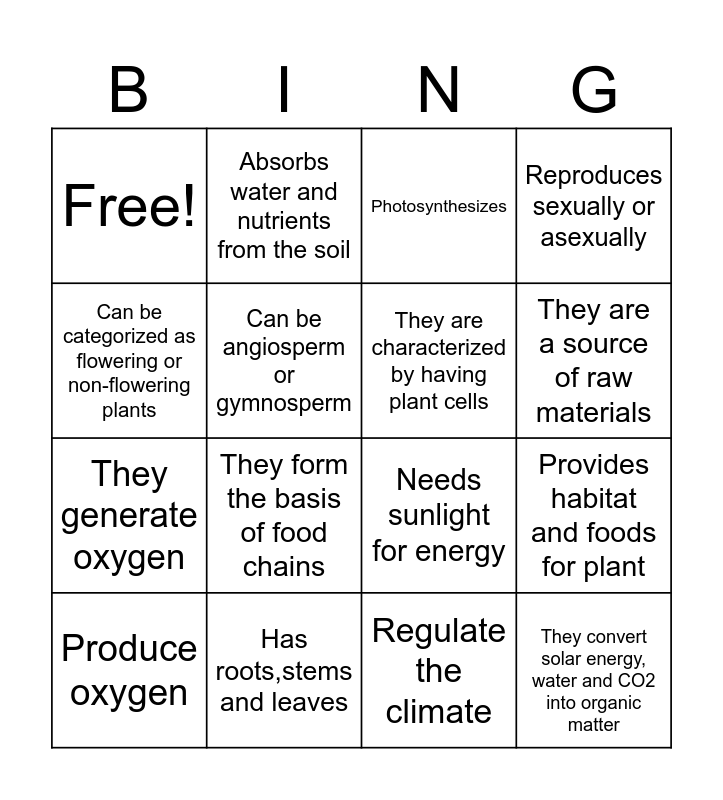 This bingo card has 16 words: Produce oxygen, Has roots,stems and leaves, Photosynthesizes, Reproduces sexually or asexually, Can be categorized as flowering or non-flowering plants, Absorbs water and nutrients from the soil, Needs sunlight for energy, Provides habitat and foods for plant, Free!, Can be angiosperm or gymnosperm, Regulate the climate, They are a source of raw materials, They generate oxygen, They form the basis of food chains, They are characterized by having plant cells and They convert solar energy, water and CO2 into organic matter.