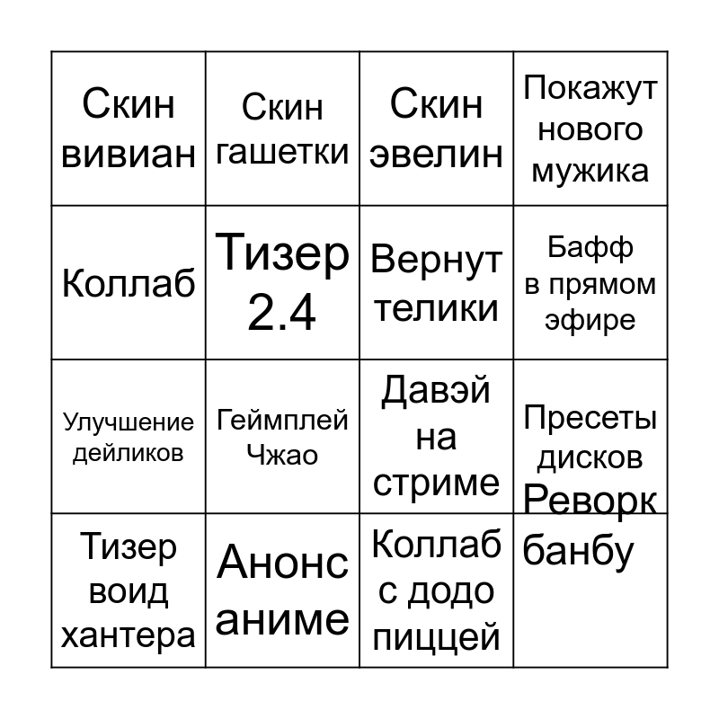 This bingo card has 16 words: Анонс аниме, Пресеты дисков, Скин эвелин, Скин вивиан, Улучшение дейликов, Скин гашетки, Давэй на стриме, Коллаб с додо пиццей, Коллаб, Тизер 2.4, Тизер воид хантера, Покажут нового мужика, Геймплей Чжао, Бафф в прямом эфире, Вернут телики and Реворк банбу.
