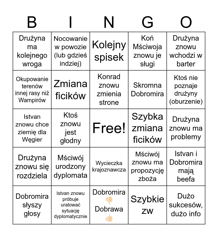 This bingo card has a free space and 24 words: Mściwój urodzony dyplomata, Istvan znowu próbuje uratować sytuację dyplomatycznie, Konrad znowu zmienia strone, Dobromira słyszy głosy, Drużyna znowu wchodzi w barter, Drużyna ma kolejnego wroga, Okupowanie terenów innej rasy niż Wampirów, Nocowanie w powozie (lub gdzieś indziej), Szybka zmiana ficików, Wycieczka krajoznawcza, Skromna Dobromira, Istvan znowu chce ziemię dla Węgier, Mściwój znowu ma propozycję zboża, Istvan i Dobromira mają beefa, Zmiana ficików, Szybkie zw, Drużyna znowu ma problemy, Kolejny spisek, Ktoś nie poznaje drużyny (oburzenie), Ktoś znowu jest głodny, Dużo sukcesów, dużo info, Drużyna znowu się rozdziela, Koń Mściwoja znowu je sługi and Dobromira 👎🏻 Dobrawa 👍🏻.