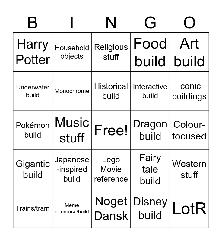 This bingo card has a free space and 24 words: Japanese -inspired build, Meme reference/build, Historical build, Trains/tram, Art build, Harry Potter, Underwater build, Household objects, Dragon build, Lego Movie reference, Interactive build, Pokémon build, Fairy tale build, Western stuff, Monochrome, Disney build, Colour-focused, Religious stuff, Iconic buildings, Music stuff, LotR, Gigantic build, Food build and Noget Dansk.