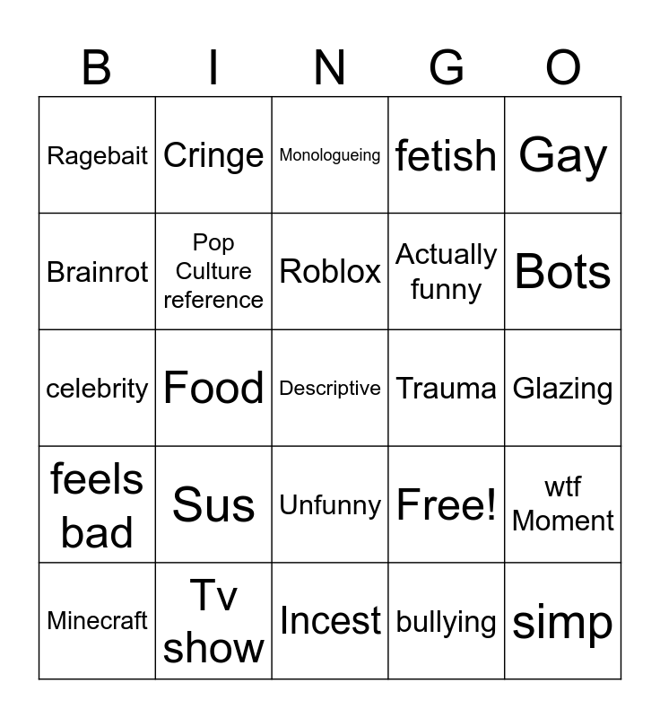 This bingo card has 25 words: Sus, Incest, Roblox, Minecraft, Gay, Ragebait, Brainrot, Cringe, Trauma, Unfunny, Actually funny, celebrity, Free!, wtf Moment, Pop Culture reference, simp, Glazing, Monologueing, Bots, Food, Descriptive, Tv show, feels bad, fetish and bullying.