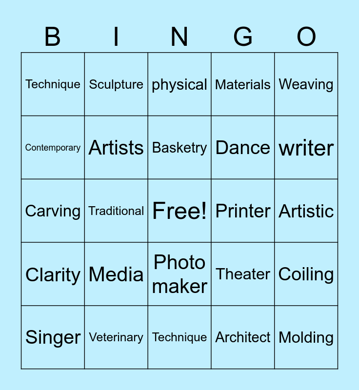 This bingo card has a free space and 24 words: Media, Veterinary, Basketry, Singer, Weaving, Technique, Contemporary, Sculpture, Printer, Photo maker, Dance, Carving, Theater, Coiling, Artists, Architect, Artistic, physical, writer, Traditional, Molding, Clarity, Materials and Technique.