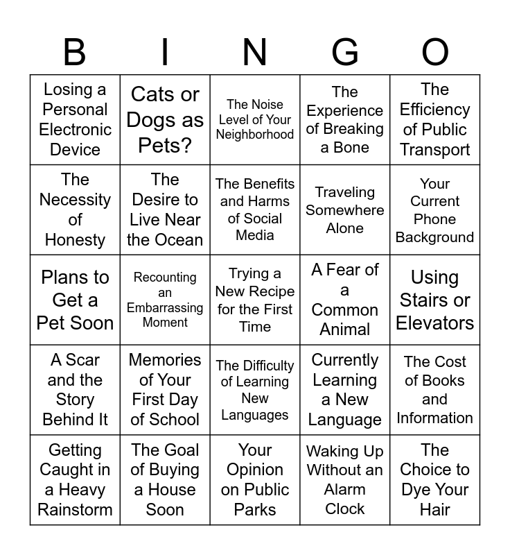 This bingo card has 66 words: Free!, Hot or Cold Coffee?, Your Job or Major: Exciting or Boring?, The Cost of Books and Information, The Best and Worst of Rainy Weather, City Life vs. Countryside Life, Cats or Dogs as Pets?, Cooking at Home vs. Eating Out, The Benefits and Harms of Social Media, Watching TV as a Pastime, The Difficulty of Learning New Languages, Money and its Role in Happiness, Using Stairs or Elevators, The Efficiency of Public Transport, Your Opinion on the Popular Dish 'Pho', The Necessity of Honesty, Recounting an Embarrassing Moment, Losing a Personal Electronic Device, The Experience of Being Lost Recently, Traveling Somewhere Alone, Memories of Your First Day of School, A Scar and the Story Behind It, The Experience of Breaking a Bone, Meeting a Celebrity in Real Life, An All-Night Work/Study Session, Witnessing Something Bizarre in Public, A Time You Changed a Major Decision, Getting Emotional While Watching a Film, Trying a New Recipe for the First Time, Being Late for a Key Event, Getting Caught in a Heavy Rainstorm, A Big Travel Adventure Planned, Future Plans to Change Career or Major, Waking Up Before 6:00 a.m. Daily, Currently Learning a New Language, The Goal of Buying a House Soon, Interest in Learning How to Drive, Plans to Get a Pet Soon, Waking Up Without an Alarm Clock, The Goal of Starting Your Own Business, The Desire to Live Near the Ocean, A Piece of Jewelry You Never Remove, A Fear of a Common Animal, The Names of Different Types of Clouds, Personal Health Facts and Broken Bones, The Experience of Living in Three or More Cities, Your Current Phone Background, Still Using an Old Electronic Device, The Choice to Dye Your Hair, Sleeping with a Stuffed Animal, Your Favorite Pair of Shoes, A Teacher Who Inspired You, The Importance of Having Close Friends, The Qualities of a Good Boss, Meeting a New Neighbor Recently, The Role of Grandparents in Modern Family Life, Visiting a Museum or Art Gallery, The Design of Your Favorite Building, The Noise Level of Your Neighborhood, Your Opinion on Public Parks, Shopping at a Small Local Market, The Importance of Being Punctual, Following the News and Current Events, Do Laws Change Over Time?, The Definition of Success and A Time You Felt Truly Bored.