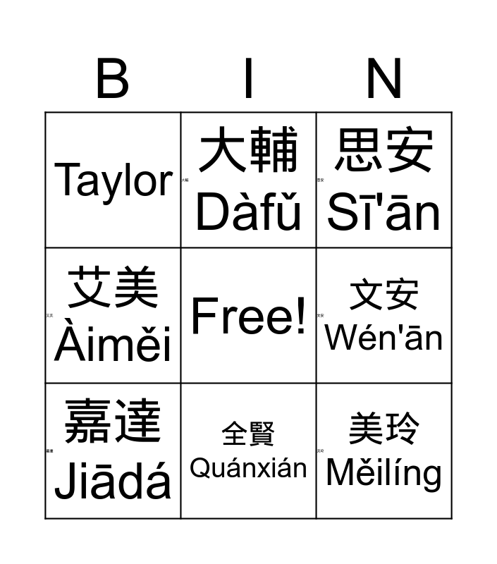 This bingo card has 6 images, a free space and 8 words: 文安 Wén'ān, 思安 Sī'ān, 大輔 Dàfǔ, 嘉達 Jiādá, Taylor, 美玲 Měilíng, 艾美 Àiměi and 全賢 Quánxián.