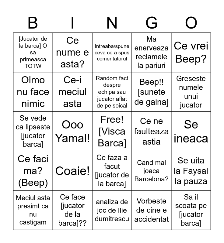 This bingo card has a free space and 24 words: Coaie!, Ce face [jucator de la barca]??, Random fact despre echipa sau jucator aflat de pe soical, Meciul asta presimt ca nu castigam, Ce vrei Beep?, [Jucator de la barca] O sa primeasca TOTW, Olmo nu face nimic, Ce nume e asta?, Ce ne faulteaza astia, Ce faza a facut [jucator de la barca], Beep!![sunete de gaina], Se vede ca lipseste [jucator barca], Cand mai joaca Barcelona?, Se uita la Faysal la pauza, Ce-i meciul asta, Vorbeste de cine e accidentat, Se ineaca, Intreaba/spune ceva ce a spus comentatorul, Greseste numele unui jucator, Ooo Yamal!, Sa il scoata pe [jucator barca], Ce faci ma?(Beep), Ma enerveaza reclamele la pariuri and analiza de joc de Ilie dumitrescu.