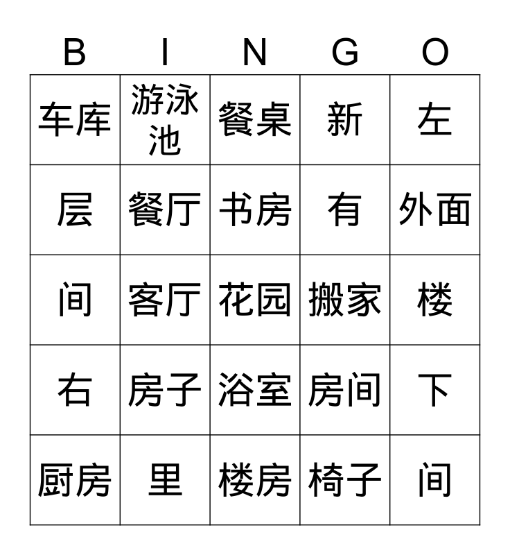 This bingo card has a free space and 24 words: 房子, 里, 书房, 厨房, 左, 车库, 层, 游泳池, 搬家, 浴室, 有, 间, 房间, 下, 餐厅, 椅子, 楼, 餐桌, 外面, 客厅, 间, 右, 新 and 楼房.