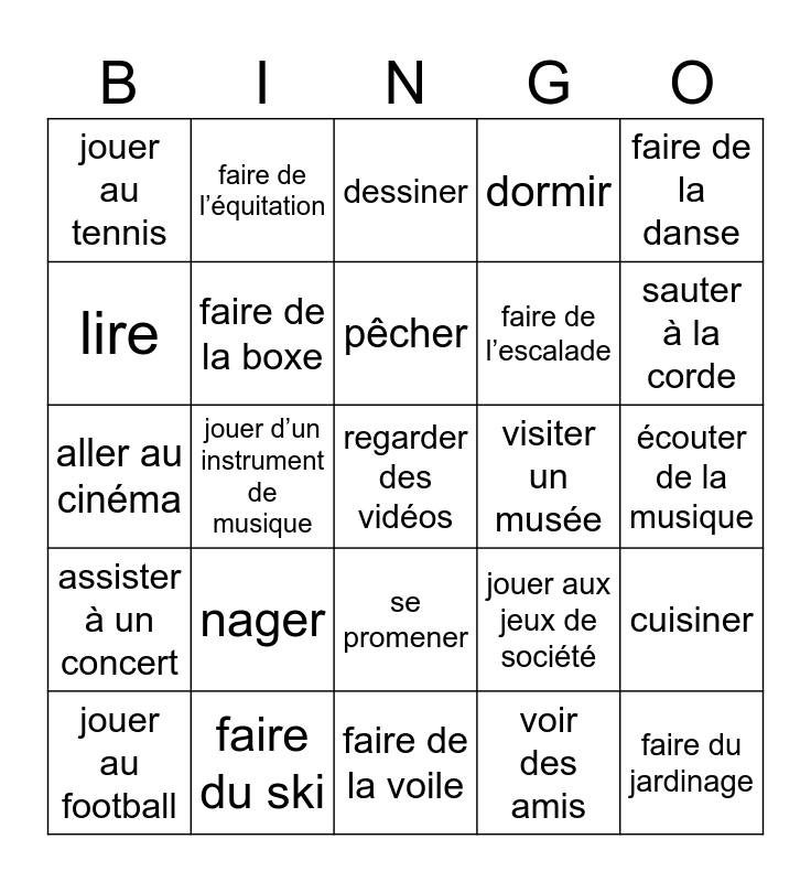 This bingo card has 25 words: nager, faire de la voile, pêcher, jouer au football, faire de la danse, jouer au tennis, lire, faire de l’équitation, visiter un musée, se promener, faire de l’escalade, aller au cinéma, jouer aux jeux de société, cuisiner, faire de la boxe, faire du jardinage, écouter de la musique, dessiner, sauter à la corde, jouer d’un instrument de musique, regarder des vidéos, faire du ski, assister à un concert, dormir and voir des amis.