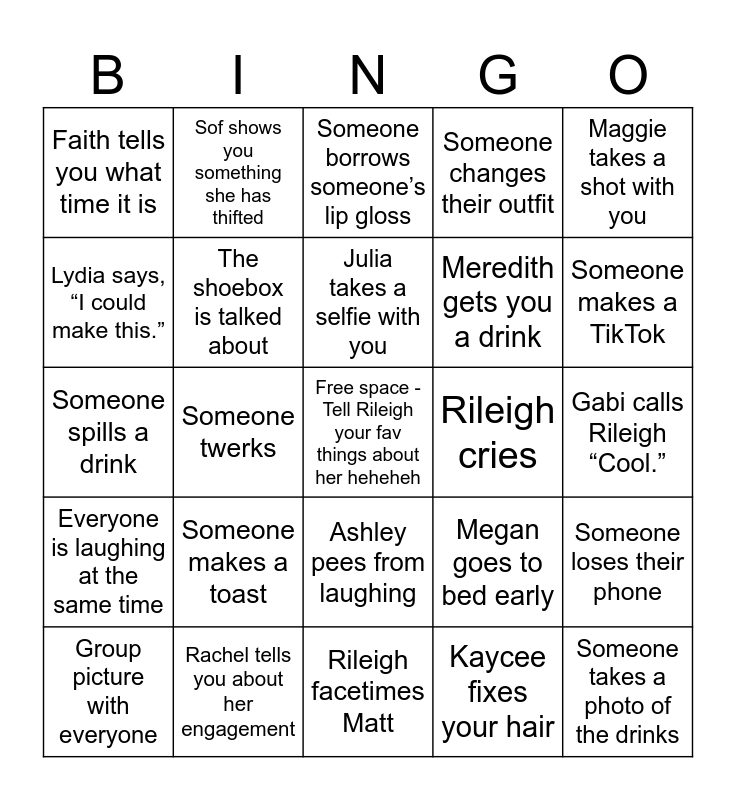 This bingo card has a free space and 26 words: Ashley pees from laughing, Kaycee fixes your hair, Julia takes a selfie with you, Rachel tells you about her engagement, Maggie takes a shot with you, Faith tells you what time it is, Lydia says, “I could make this.”, Sof shows you something she has thifted, Gabi calls Rileigh “Cool.”, Megan goes to bed early, Meredith gets you a drink, Someone spills a drink, Someone loses their phone, Group picture with everyone, Someone twerks, Someone tells an embarrassing story about Rileigh, Someone changes their outfit, Everyone is laughing at the same time, Someone borrows someone’s lip gloss, Someone takes a photo of the drinks, Someone makes a TikTok, Rileigh facetimes Matt, Rileigh cries, Someone makes a toast, The shoebox is talked about and Squash is talked about.