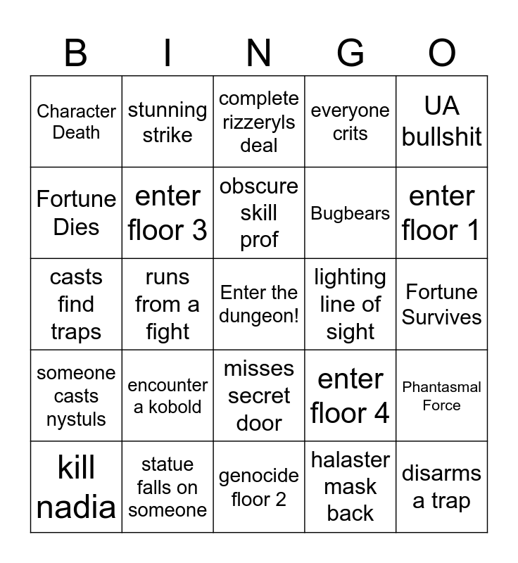 This bingo card has a free space and 24 words: encounter a kobold, statue falls on someone, obscure skill prof, kill nadia, UA bullshit, Character Death, Fortune Dies, stunning strike, lighting line of sight, misses secret door, Bugbears, casts find traps, enter floor 4, Phantasmal Force, enter floor 3, halaster mask back, Fortune Survives, complete rizzeryls deal, enter floor 1, runs from a fight, disarms a trap, someone casts nystuls, everyone crits and genocide floor 2.