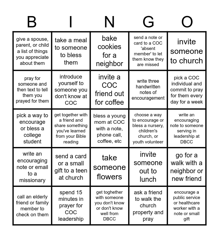 This bingo card has a free space and 24 words: send a card or a small gift to a teen at church, spend 15 minutes in prayer for COC leadership, invite a COC friend out for coffee, call an elderly friend or family member to check on them, invite someone to church, give a spouse, parent, or child a list of things you appreciate about them, pray for someone and then text to tell them you prayed for them, take a meal to someone to bless them, choose a way to encourage or bless a nursery, children's church, or youth volunteer, take someone flowers, write three handwritten notes of encouragement, pick a way to encourage or bless a college student, invite someone out to lunch, go for a walk with a neighbor or new friend, introduce yourself to someone you don't know at COC, ask a friend to walk the church property and pray, write an encouraging note to someone serving in leadership at DBCC, bake cookies for a neighbor, pick a COC individual and commit to pray for them every day for a week, get together with a friend and share something you've learned from your Bible reading, encourage a public service or healthcare worker with a note or small gift, write an encouraging note or email to a missionary, send a note or card to a COC 'absent member' to let them know they are missed and get toghether with someone you don't know or don't know well from DBCC.