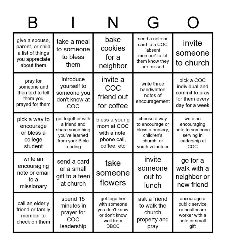 This bingo card has a free space and 24 words: send a card or a small gift to a teen at church, spend 15 minutes in prayer for COC leadership, invite a COC friend out for coffee, call an elderly friend or family member to check on them, invite someone to church, give a spouse, parent, or child a list of things you appreciate about them, pray for someone and then text to tell them you prayed for them, take a meal to someone to bless them, choose a way to encourage or bless a nursery, children's church, or youth volunteer, take someone flowers, write three handwritten notes of encouragement, pick a way to encourage or bless a college student, invite someone out to lunch, go for a walk with a neighbor or new friend, introduce yourself to someone you don't know at COC, ask a friend to walk the church property and pray, write an encouraging note to someone serving in leadership at COC, bake cookies for a neighbor, pick a COC individual and commit to pray for them every day for a week, get together with a friend and share something you've learned from your Bible reading, encourage a public service or healthcare worker with a note or small gift, write an encouraging note or email to a missionary, send a note or card to a COC 'absent member' to let them know they are missed and get together with someone you don't know or don't know well from DBCC.