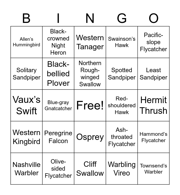 This bingo card has a free space and 44 words: Wilson’s Warbler, Townsend’s Warbler, Orange-crowned Warbler, Nashville Warbler, Yellow Warbler, Warbling Vireo, Western Tanager, Black-headed Grosbeak, Pacific-slope Flycatcher, Olive-sided Flycatcher, Swainson’s Hawk, Red-shouldered Hawk, Osprey, Peregrine Falcon, Barn Swallow, Cliff Swallow, Violet-green Swallow, Vaux’s Swift, Red-necked Phalarope, Least Sandpiper, Black-crowned Night Heron, Greater Yellowlegs, Rufous Hummingbird, Allen’s Hummingbird, Yellow-rumped Warbler, Hermit Thrush, Cedar Waxwing, Lazuli Bunting, Ash-throated Flycatcher, Western Kingbird, Cassin’s Vireo, Hammond’s Flycatcher, MacGillivray’s Warbler, Western Wood-Pewee, Blue-gray Gnatcatcher, Lincoln’s Sparrow, Savannah Sparrow, Green-tailed Towhee, Northern Rough-winged Swallow, Solitary Sandpiper, Spotted Sandpiper, Long-billed Dowitcher, Black-bellied Plover and Whimbrel.