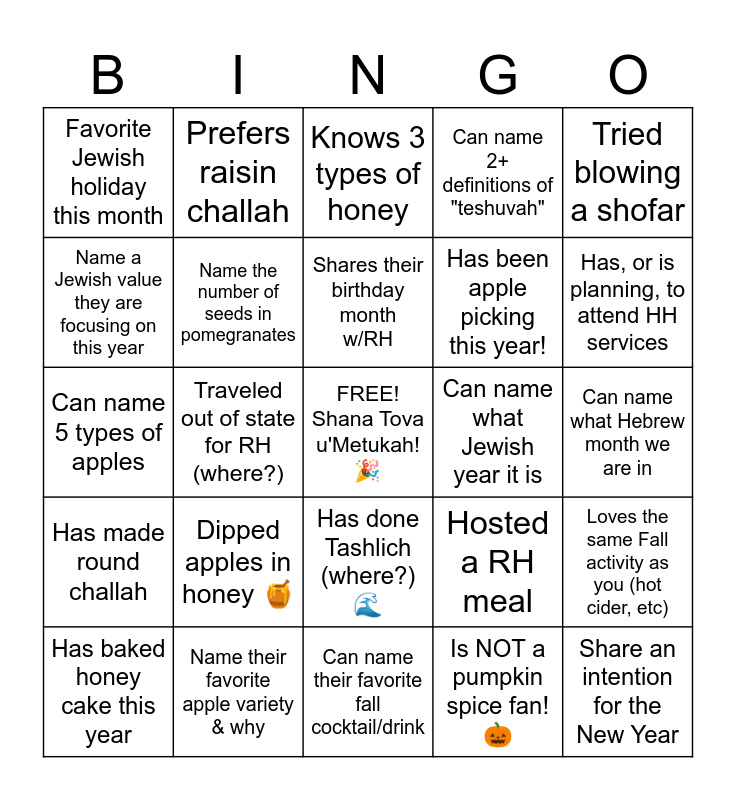 This bingo card has a free space and 24 words: Dipped apples in honey 🍯, Name their favorite apple variety & why, Shares their birthday month w/RH, Has baked honey cake this year, Tried blowing a shofar, Favorite Jewish holiday this month, Name a Jewish value they are focusing on this year, Prefers raisin challah, Can name what Jewish year it is, Has done Tashlich (where?) 🌊, Has been apple picking this year!, Can name 5 types of apples, Hosted a RH meal, Loves the same Fall activity as you (hot cider, etc), Name the number of seeds in pomegranates, Is NOT a pumpkin spice fan! 🎃, Can name what Hebrew month we are in, Knows 3 types of honey, Has, or is planning, to attend HH services, Traveled out of state for RH (where?), Share an intention for the New Year, Has made round challah, Can name 2+ definitions of "teshuvah" and Can name their favorite fall cocktail/drink.