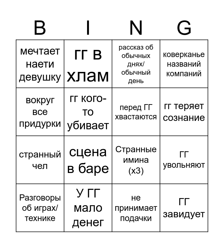 This bingo card has 16 words: У ГГ мало денег, ГГ увольняют, рассказ об обычных днях/обычный день, мечтает наети девушку, странный чел, гг в хлам, Странные имина (x3), не принимает подачки, вокруг все придурки, гг кого-то убивает, Разговоры об играх/технике, коверканье названий компаний, сцена в баре, гг теряет сознание, перед ГГ хвастаются and ГГ завидует.