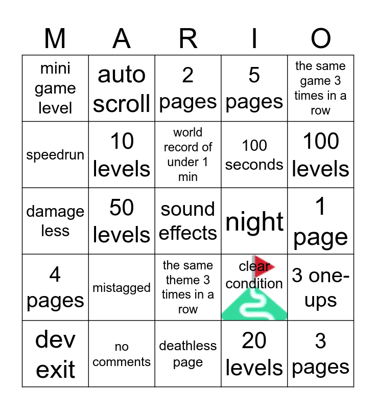 This bingo card has 1 images, a free space and 24 words: mistagged, no comments, world record of under 1 min, dev exit, the same game 3 times in a row, mini game level, speedrun, auto scroll, night, the same theme 3 times in a row, 100 seconds, damage less, clear condition, 3 one-ups, 10 levels, 20 levels, 1 page, 2 pages, 100 levels, 50 levels, 3 pages, 4 pages, 5 pages and deathless page.