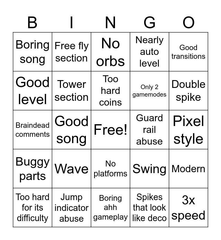 This bingo card has a free space and 24 words: Wave, Jump indicator abuse, Too hard coins, Too hard for its difficulty, Good transitions, Boring song, Good level, Free fly section, Guard rail abuse, No platforms, Only 2 gamemodes, Braindead comments, Swing, Modern, Tower section, Spikes that look like deco, Pixel style, No orbs, Double spike, Good song, 3x speed, Buggy parts, Nearly auto level and Boring ahh gameplay.