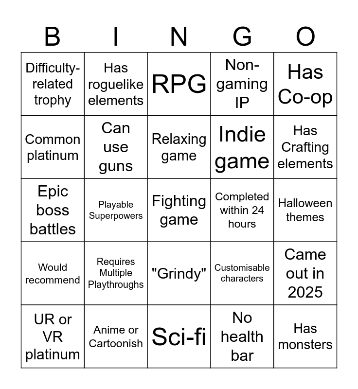 This bingo card has a free space and 24 words: Requires Multiple Playthroughs, Anime or Cartoonish, Relaxing game, UR or VR platinum, Has Co-op, Difficulty-related trophy, Common platinum, Has roguelike elements, Completed within 24 hours, "Grindy", Indie game, Epic boss battles, Customisable characters, Came out in 2025, Can use guns, No health bar, Halloween themes, RPG, Has Crafting elements, Playable Superpowers, Has monsters, Would recommend, Non-gaming IP and Sci-fi.