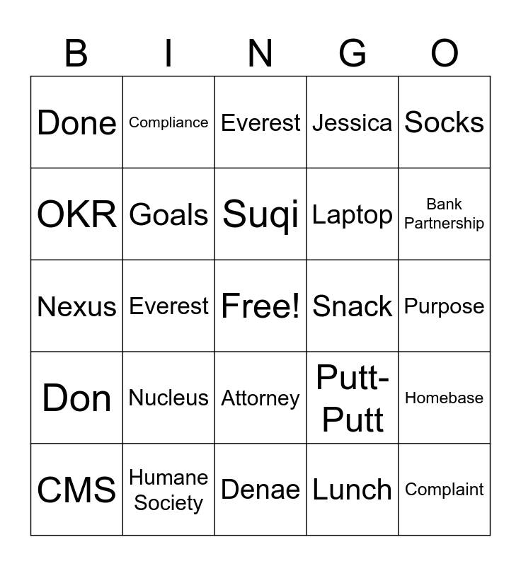 This bingo card has a free space and 45 words: CFPB, Complaint, Advance America, CMS, Kate, Lunch, Everest, Purpose Money, Socks, Humane Society, Jessica, Snack, Attorney, Nucleus, SOctober, Denae, First Electronic Bank, Nexus, Testing, Bank Partnership, Compliance, AI, Risk- based, Done, CFPB, Purpose, IO, Dog, Putt-Putt, Don, Project Keystone, Homebase, AI, Advance America, Purpose Money, Everest, Jessica, SOctober, Testing, Suqi, OKR, Laptop, Hotel, Goals and Teambuilding.