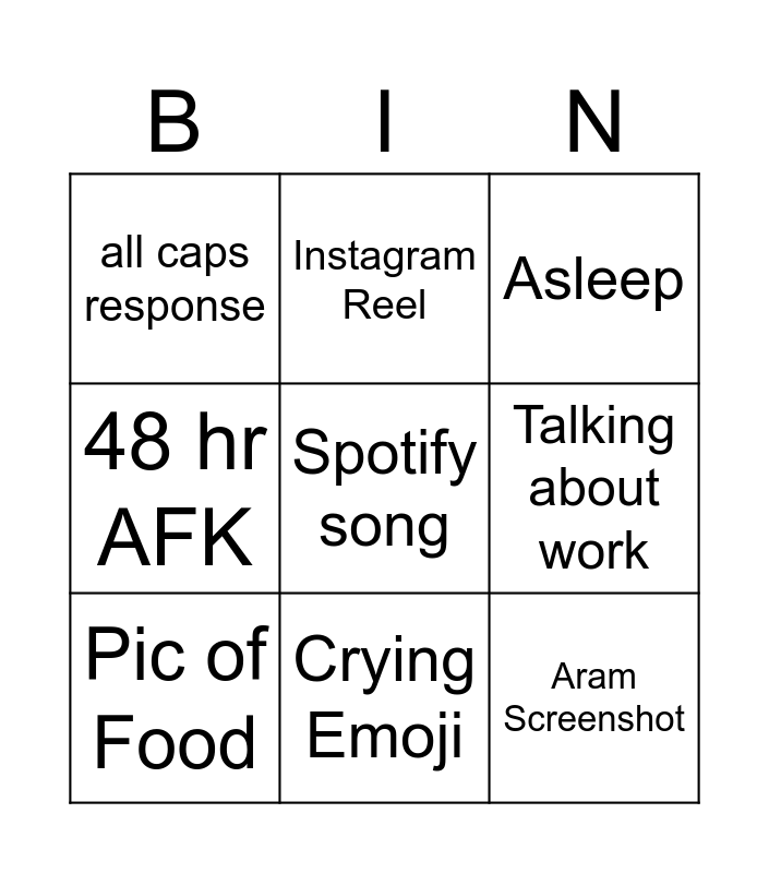 This bingo card has a free space and 8 words: Talking about work, Asleep, Instagram Reel, Pic of Food, all caps response, Aram Screenshot, 48 hr AFK and Crying Emoji.