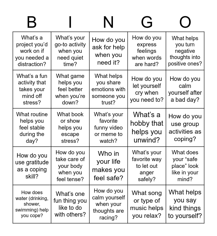 This bingo card has 50 words: What’s your favorite way to calm down when you feel anxious?, What’s your favorite funny video or meme to watch?, How do you remind yourself to breathe when stressed?, How do you calm yourself when your thoughts are racing?, How do you take care of your body when you feel tense?, Who do you call or text when you want to distract yourself?, What’s your go-to activity when you need quiet time?, What’s something playful you do to lift your mood?, What’s a fun activity that takes your mind off stress?, What kind of art or creative outlet helps you cope?, What game helps you feel better when you’re down?, How do you express feelings when words are hard?, What does your “safe place” look like in your mind?, What’s your favorite way to let out anger safely?, What’s a smell that makes you feel calm?, What’s a chore or task that actually helps distract you?, What helps you share emotions with someone you trust?, What’s a hobby that helps you unwind?, What’s your favorite way to get out of the house?, What helps you turn negative thoughts into positive ones?, What book or show helps you escape stress?, What song or type of music helps you relax?, What’s a project you’d work on if you needed a distraction?, How do you let yourself cry when you need to?, What coping skill helps you relax before bed?, What helps you say kind things to yourself?, How do you calm yourself after a bad day?, Who can you talk to when you’re upset?, How do you ask for help when you need it?, Who in your life makes you feel safe?, What’s one thing you can do instead of yelling?, What’s one coping skill that helps when you’re frustrated?, How do you celebrate when you feel proud of yourself?, What coping skill do you use with friends?, What’s one fun thing you like to do with others?, How do you show kindness to others when you’re stressed?, Who makes you laugh when you’re sad?, How do you connect with people when you feel isolated?, What’s one way you support a friend when they’re upset?, How do you use group activities as coping?, What’s your favorite form of exercise or movement?, How does nature help you cope?, What’s your favorite healthy snack that boosts your mood?, What’s one grounding skill that works for you?, How does water (drinking, shower, swimming) help you cope?, What routine helps you feel stable during the day?, How do you remind yourself to rest when tired?, What’s one small self-care activity you can do daily?, How do you use gratitude as a coping skill? and What’s one thing you do to make tomorrow easier?.