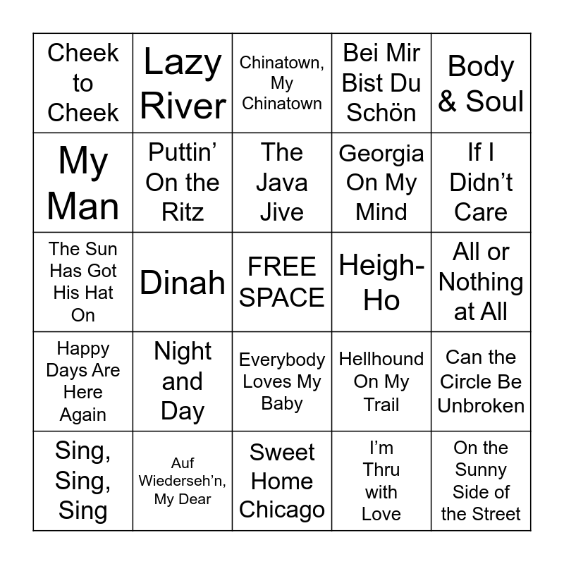 This bingo card has a free space and 70 words: All of Me, All or Nothing at All, As Time Goes By, A-Tisket, A-Tasket, Auf Wiederseh’n, My Dear, Begin the Beguine, Bei Mir Bist Du Schön, Blue Yodel No. 8, Body & Soul, Brother, Can You Spare a Dime?, Can the Circle Be Unbroken, Caravan, Cheek to Cheek, Chinatown, My Chinatown, Dry Bones, Dinah, Everybody Loves My Baby, Georgia On My Mind, God Bless America, Happy Days Are Here Again, Heigh-Ho, Hellhound On My Trail, If I Didn’t Care, In The Mood, It Don’t Mean a Thing (If It Ain’t Got That Swing), It’s a Sin to Tell a Lie, I’ll See You in My Dreams, I’m In the Mood for Love, I’m Thru with Love, I’ve Told Ev’ry Little Star, Lazy River, Let’s Fall in Love, Lili Marlene, Love For Sale, Me and the Devil Blues, Minnie The Moocher, Minnie’s Yoo Hoo, Mood Indigo, Moonlight Serenade, My Man, My Prayer, Night and Day, On the Sunny Side of the Street, Over the Rainbow, Pennies From Heaven, Puttin’ On the Ritz, Sing, Sing, Sing, Smoke Gets in Your Eyes, South of the Border, St. Louis Blues, Stompin At the Savoy, Stormy Weather, Strange Fruit, Summertime, Sweet Home Chicago, Teddy Bears Picnic, The Java Jive, The Joint is Jumpin, The Man I Love, There’s Danger in Your Eyes, Cherie!, The Sun Has Got His Hat On, The Very Thought of You, The Way You Look Tonight, Wabash Cannonball, We’ll Meet Again, What Would You Give in Exchange for Your Soul, When It’s Sleepy Time Down South, Whistle While You Work, Who’s Afraid of the Big, Bad Wolf? and Your Feet’s Too Big.