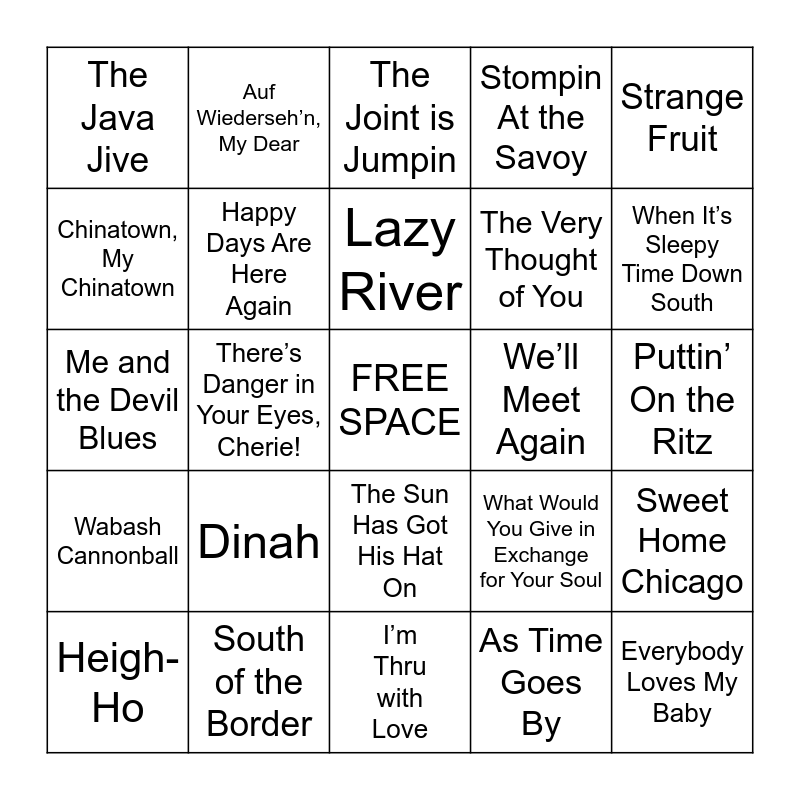 This bingo card has a free space and 70 words: Pennies From Heaven, Puttin’ On the Ritz, Sing, Sing, Sing, Smoke Gets in Your Eyes, South of the Border, St. Louis Blues, Stompin At the Savoy, Stormy Weather, Strange Fruit, Summertime, Sweet Home Chicago, Teddy Bears Picnic, The Java Jive, The Joint is Jumpin, The Man I Love, There’s Danger in Your Eyes, Cherie!, The Sun Has Got His Hat On, The Very Thought of You, The Way You Look Tonight, Wabash Cannonball, We’ll Meet Again, What Would You Give in Exchange for Your Soul, When It’s Sleepy Time Down South, Whistle While You Work, Who’s Afraid of the Big, Bad Wolf?, Your Feet’s Too Big, All of Me, All or Nothing at All, As Time Goes By, A-Tisket, A-Tasket, Auf Wiederseh’n, My Dear, Begin the Beguine, Bei Mir Bist Du Schön, Blue Yodel No. 8, Body & Soul, Brother, Can You Spare a Dime?, Can the Circle Be Unbroken, Caravan, Cheek to Cheek, Chinatown, My Chinatown, Dry Bones, Dinah, Everybody Loves My Baby, Georgia On My Mind, God Bless America, Happy Days Are Here Again, Heigh-Ho, Hellhound On My Trail, If I Didn’t Care, In The Mood, It Don’t Mean a Thing (If It Ain’t Got That Swing), It’s a Sin to Tell a Lie, I’ll See You in My Dreams, I’m In the Mood for Love, I’m Thru with Love, I’ve Told Ev’ry Little Star, Lazy River, Let’s Fall in Love, Lili Marlene, Love For Sale, Me and the Devil Blues, Minnie The Moocher, Minnie’s Yoo Hoo, Mood Indigo, Moonlight Serenade, My Man, My Prayer, Night and Day, On the Sunny Side of the Street and Over the Rainbow.