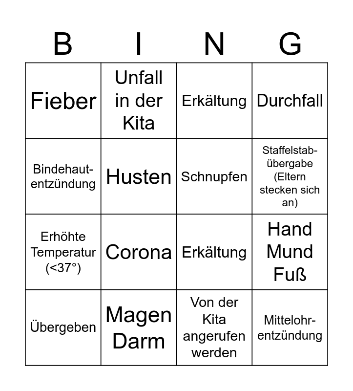 This bingo card has 16 words: Magen Darm, Hand Mund Fuß, Erkältung, Fieber, Erhöhte Temperatur (<37°), Unfall in der Kita, Erkältung, Von der Kita angerufen werden, Bindehaut-entzündung, Husten, Übergeben, Durchfall, Corona, Staffelstab-übergabe (Eltern stecken sich an), Schnupfen and Mittelohr-entzündung.