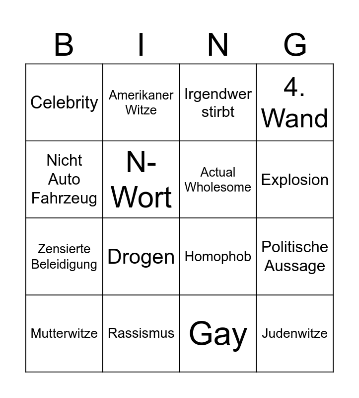 This bingo card has 16 words: Rassismus, Politische Aussage, Irgendwer stirbt, Celebrity, Zensierte Beleidigung, Amerikaner Witze, Homophob, Gay, Nicht Auto Fahrzeug, N-Wort, Mutterwitze, 4. Wand, Drogen, Explosion, Actual Wholesome and Judenwitze.