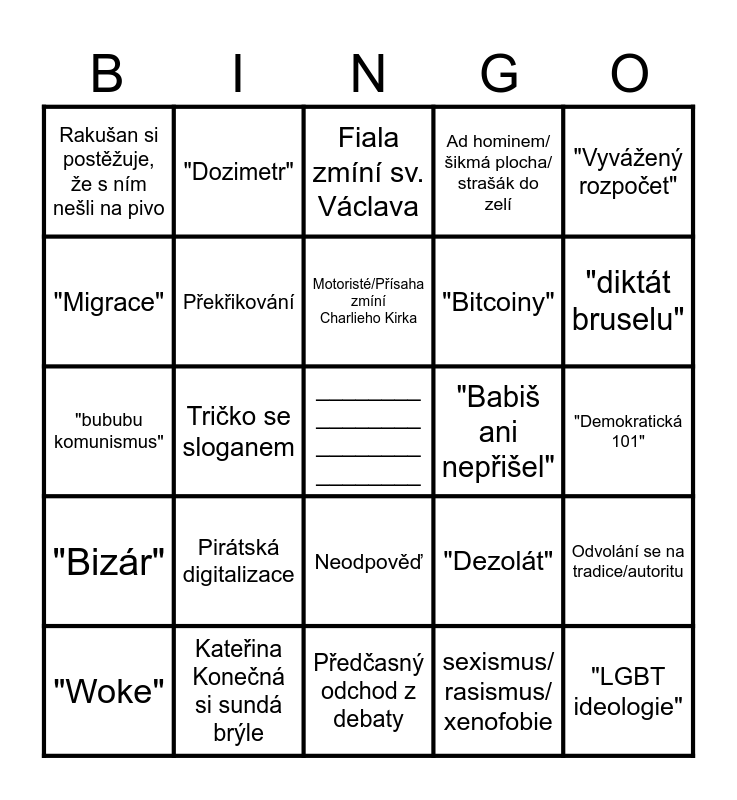 This bingo card has a free space and 30 words: Kateřina Konečná si sundá brýle, Tykání, Tričko se sloganem, "Skibidi" "Brainrot" "Bestie", Rakušan si postěžuje, že s ním nešli na pivo, Fiala zmíní sv. Václava, Překřikování, Neodpověď, "Babiš ani nepřišel", Předčasný odchod z debaty, "Demokratická 101", "LGBT ideologie", sexismus/ rasismus/ xenofobie, Hydratace 💦💦💦, "diktát bruselu", "Dezinformace", "Dezolát", "Bizár", Pirátská digitalizace, "Vyvážený rozpočet", "bububu komunismus", Sprostá slova, "Dozimetr", "Bitcoiny", "Migrace", Ad hominem/šikmá plocha/ strašák do zelí, Odvolání se na tradice/autoritu, "Woke", Motoristé/Přísaha zmíní Charlieho Kirka and "Grýndýl".